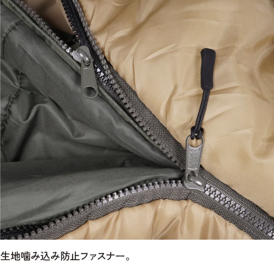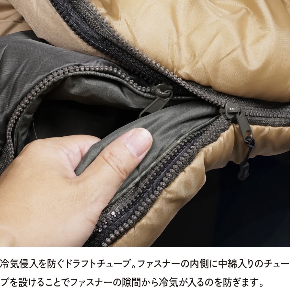 ●上部からの冷気を防ぐドローコード付きのフード、首からの冷気侵入を防ぐショルダーウォーマー、ファスナーからの冷気侵入を防ぐドラフトチューブ、寒い夜を快適にすごすため細かいところまでこだわり作り込まれています。