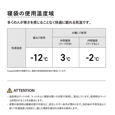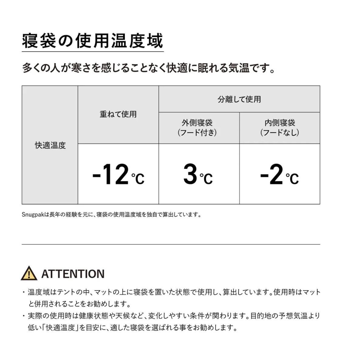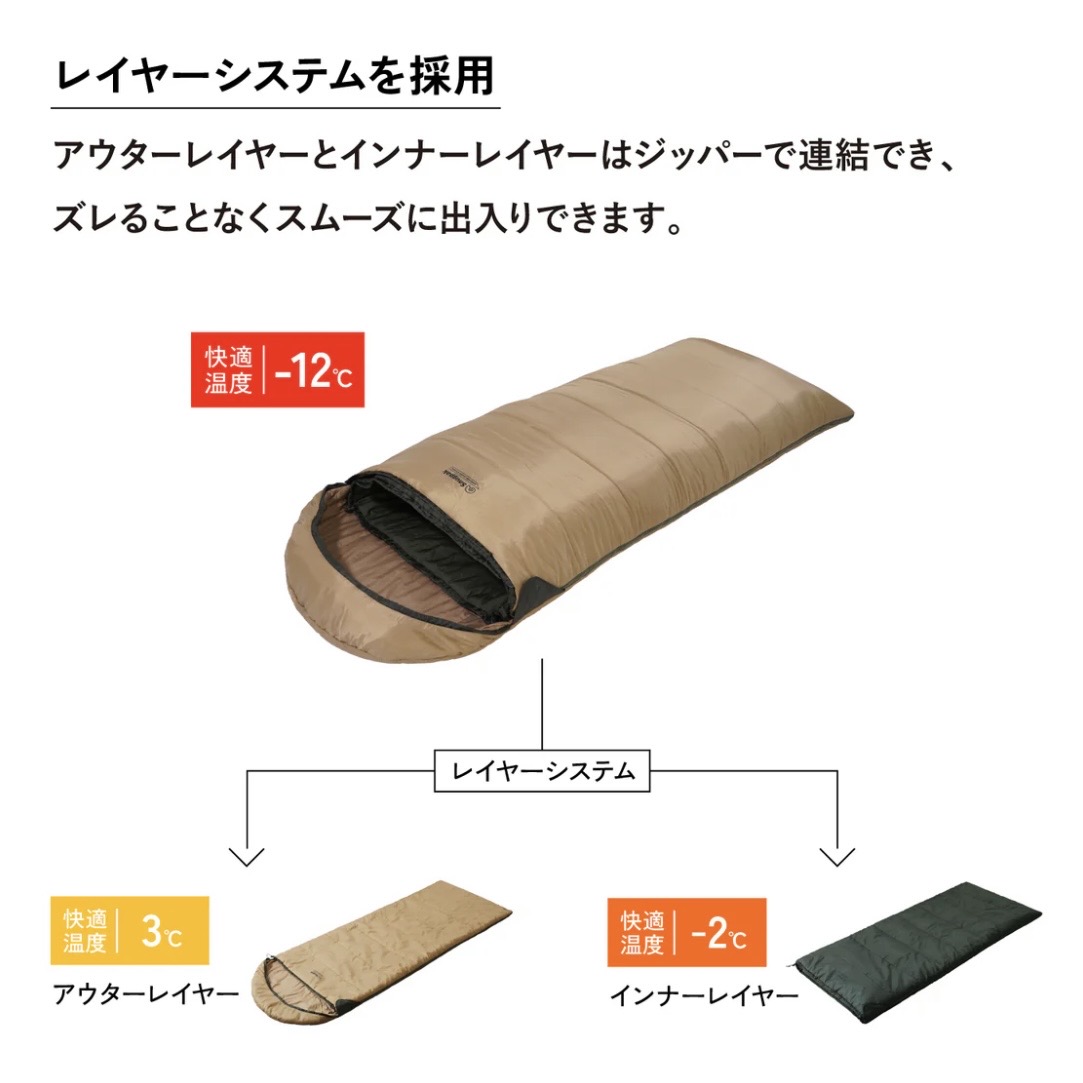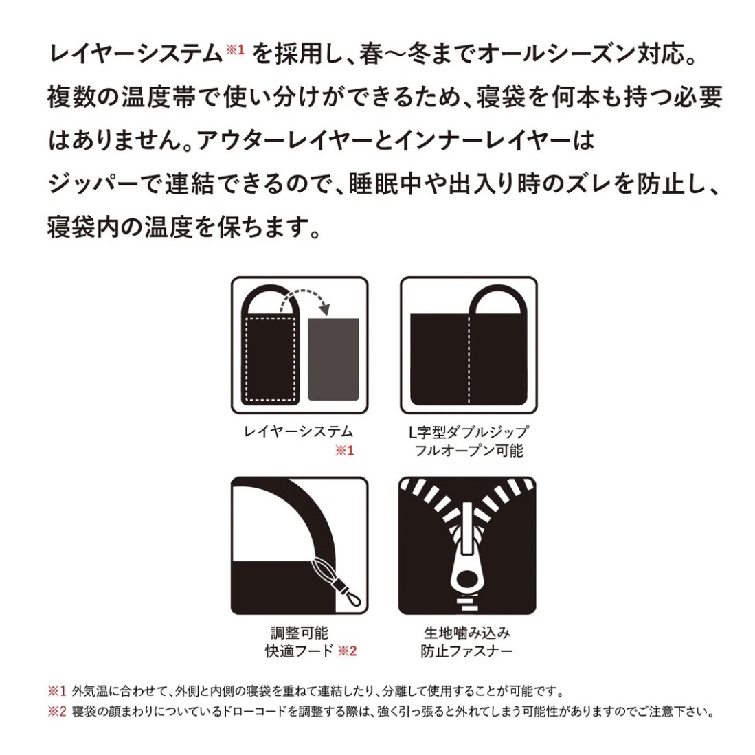 ●2枚の寝袋を重ねて使うレイヤー仕様、1枚で使うこともできるため3つの温度帯に対応可能。
