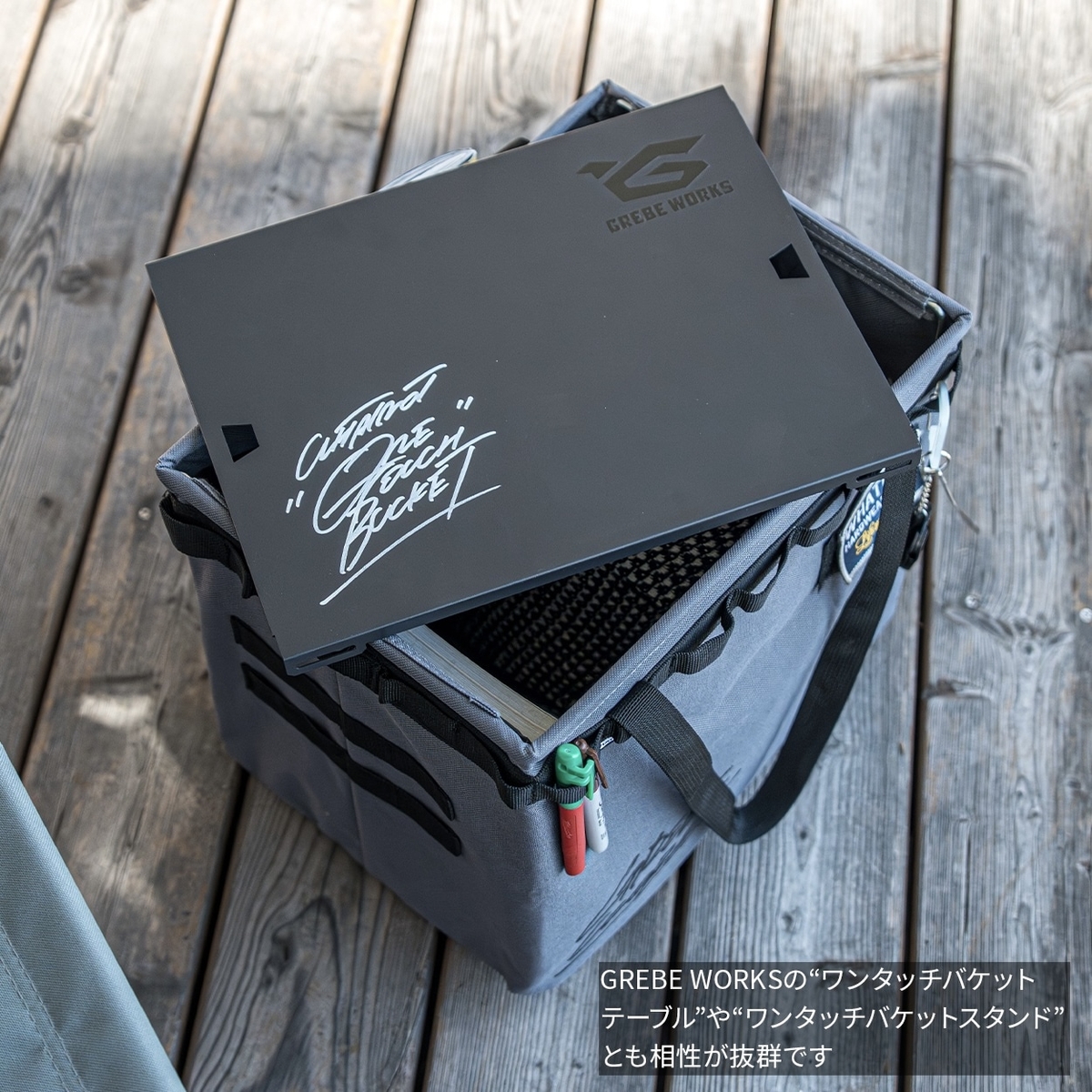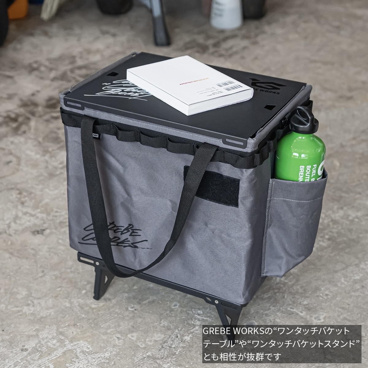 今までになかったグレーカラーでGREBE WORKSの“ワンタッチバケットテーブル”や“ワンタッチバケットスタンド”とも相性が抜群です!
